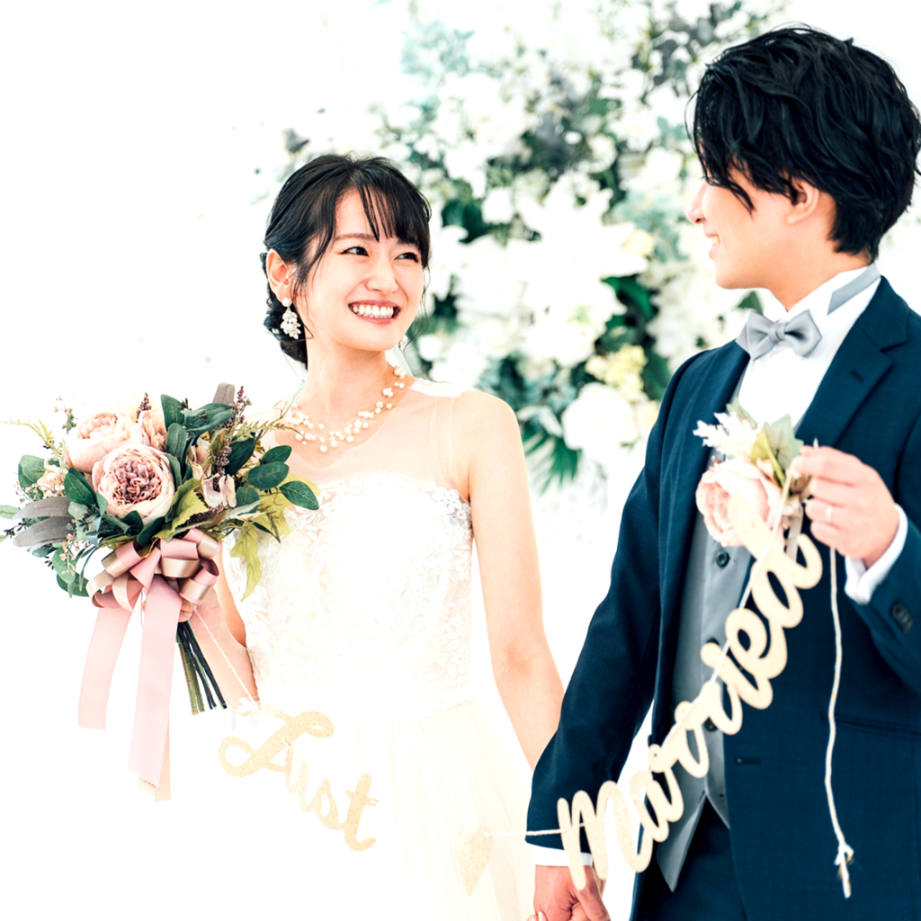私たちはこのたび結婚いたしました。これからは二人で力を合わせ、温かい家庭を築いてまいります。これからもご指導ご鞭撻のほど、よろしくお願い申し上げます。令和○○年○月太郎 & 花子